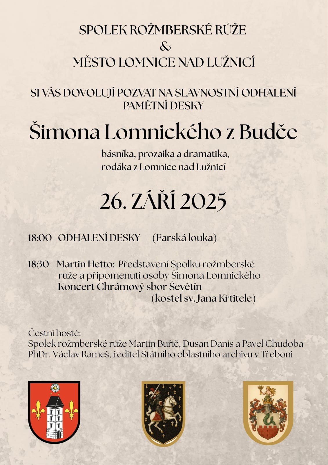 Spolek rožmberské růže – PWR spolu s městem Lomnice nad Lužnicí Vás srdečně zvou na slavnostní odhalení pamětní desky básníku a spisovateli Šimonu Lomnickému z Budče (1552–1623),